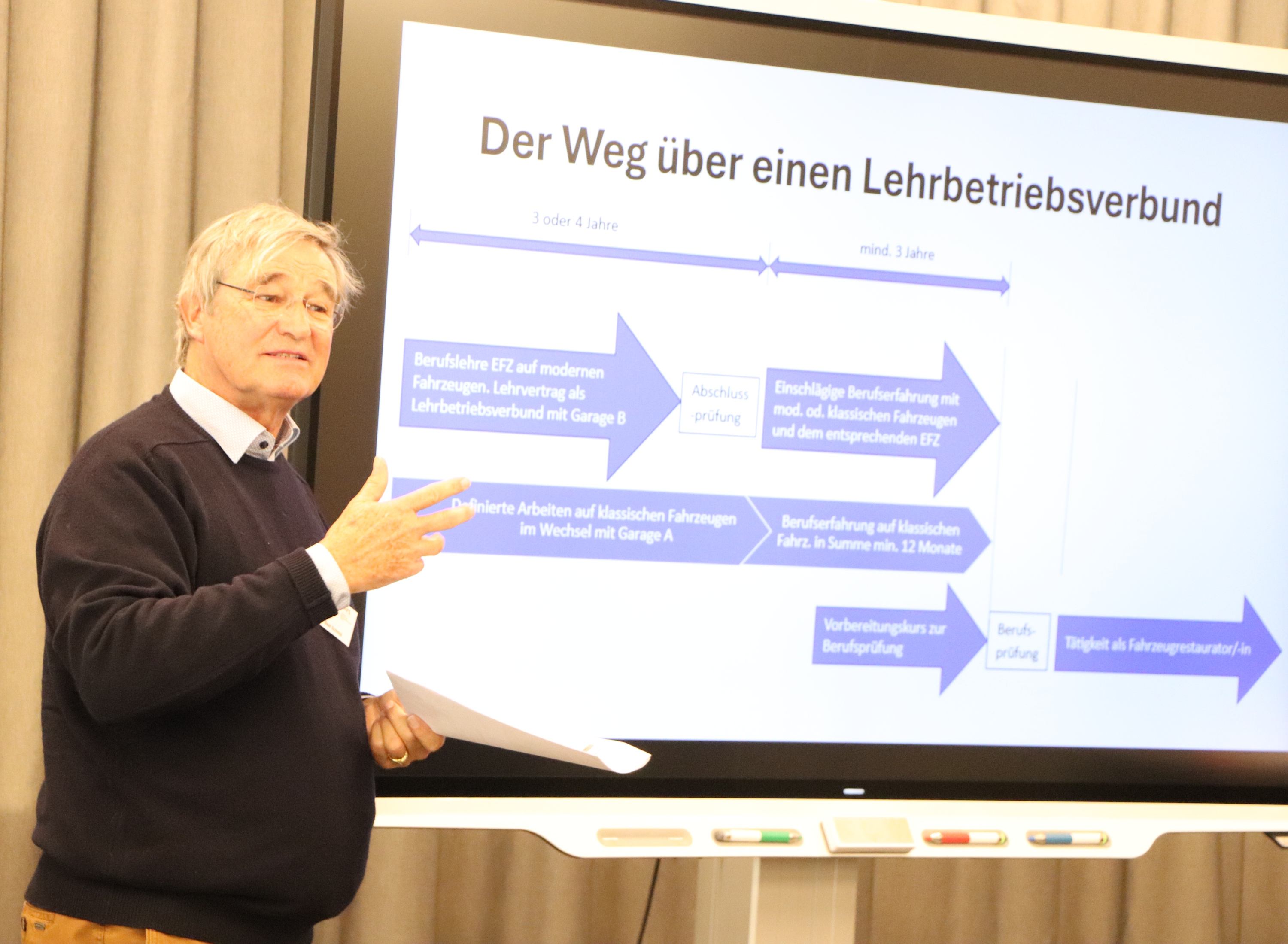 Den Weg zum Fahrzeugrestaurator ebnen könnten auch Lehrbetriebsverbünde, führte Schmid weiter aus. «Damit haben wir gute Erfahrungen gemacht», berichtete Stefan Mäder, Geschäftsführer von British Inter Cars in Täuffelen, aus der Praxis.